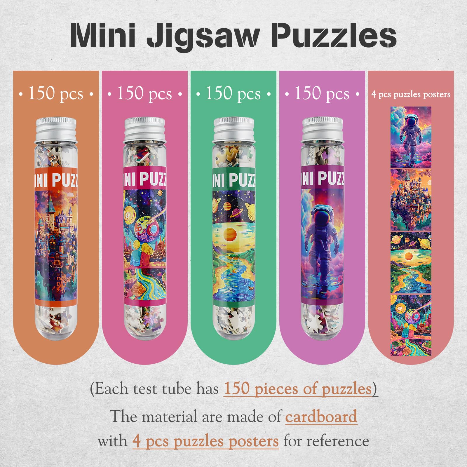 - Jigsaw puzzles 150 pieces -- puzzles for adults are include 4 pcs separate test tube packaging, each puzzle with 150 pieces. Each pieces puzzles smaller than your finger. This set of jigsaw puzzle completed size: 6 x 4 in/15 x 10 cm (Not including frame).
