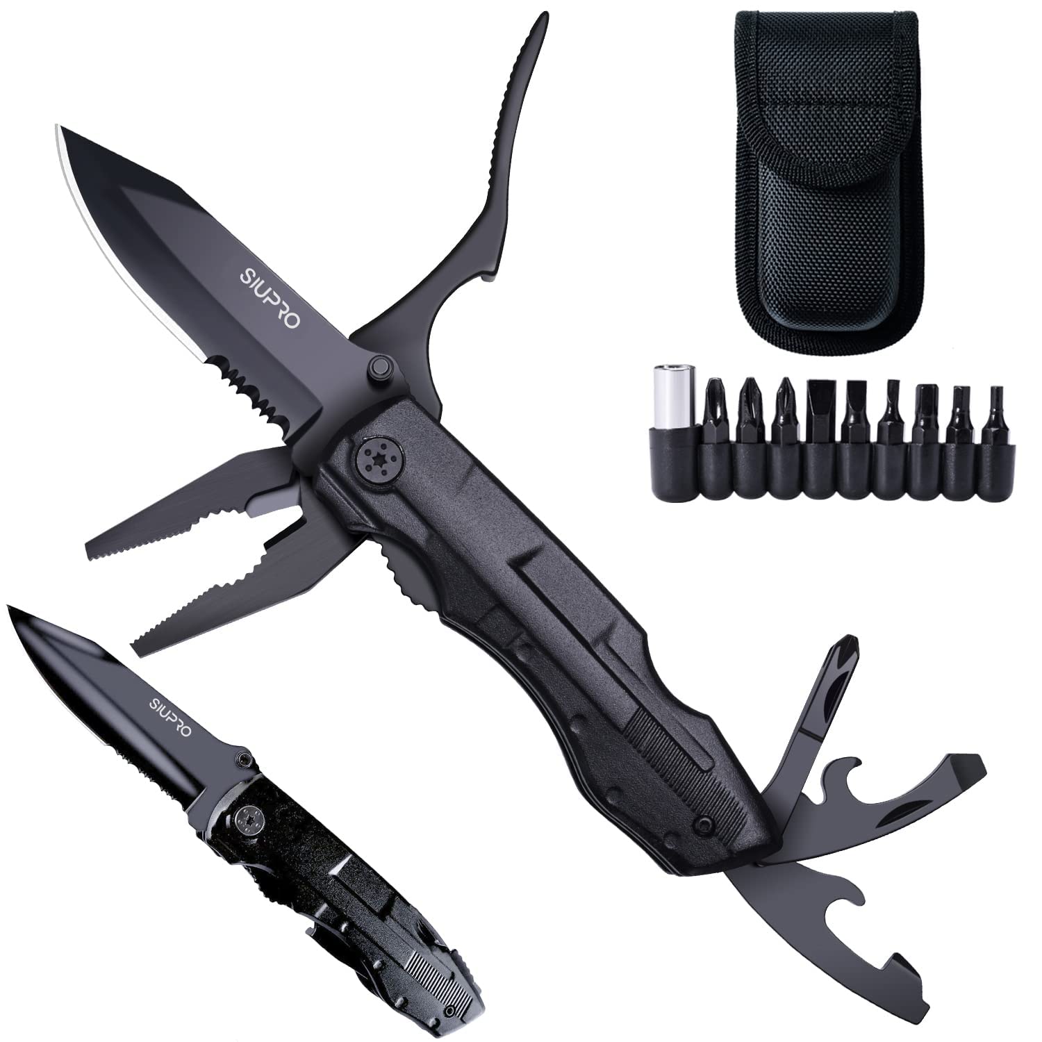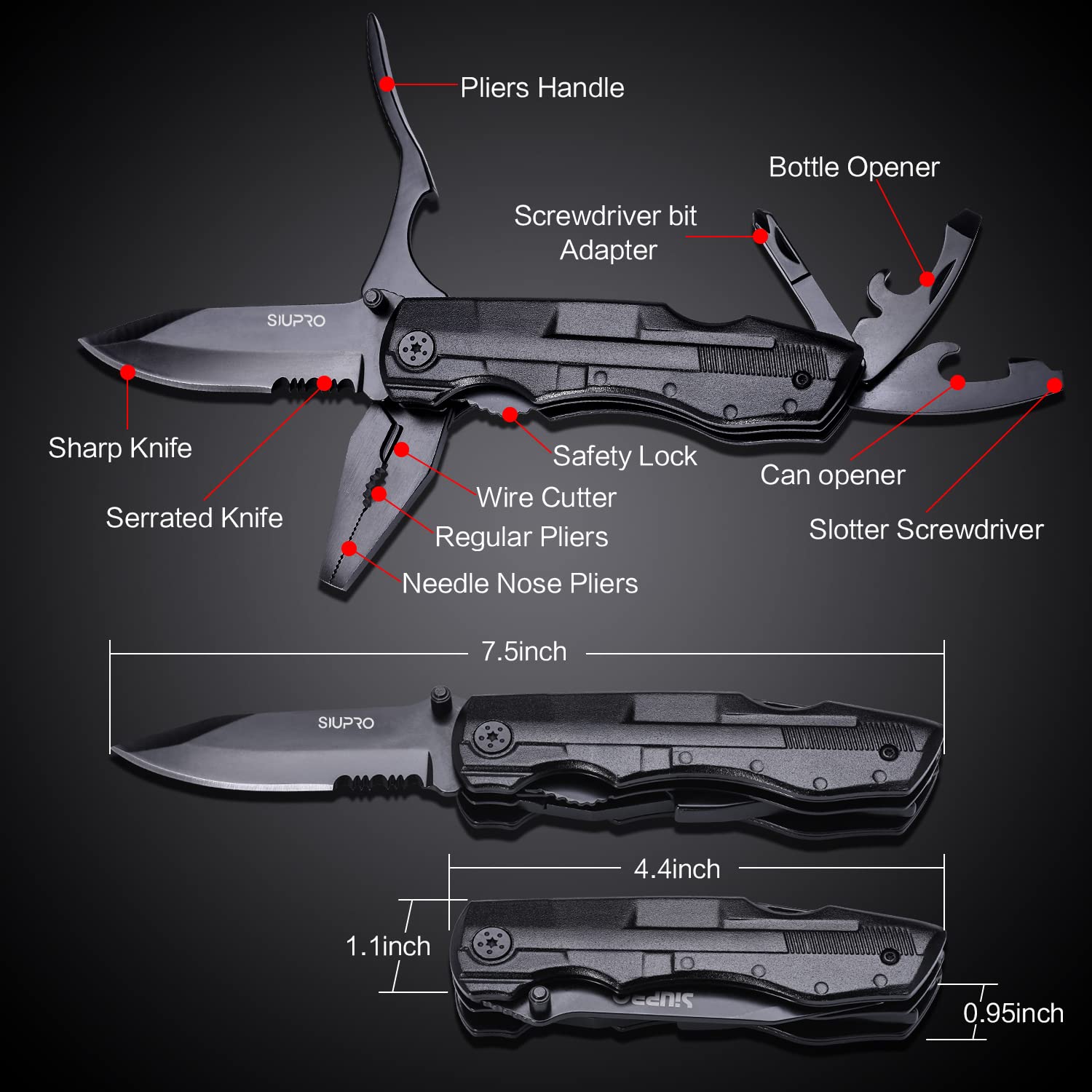 - 【All In One Tool】- Knife, pliers, can opener, bottle opener, and 9-in-1 screwdriver bit kit guarantees a multi-purpose using. It’s well built with stainless steel and coated with black oxidation. Perfect for hunting, fishing, travel, car, backpacking, hiking, outdoor activities, and work