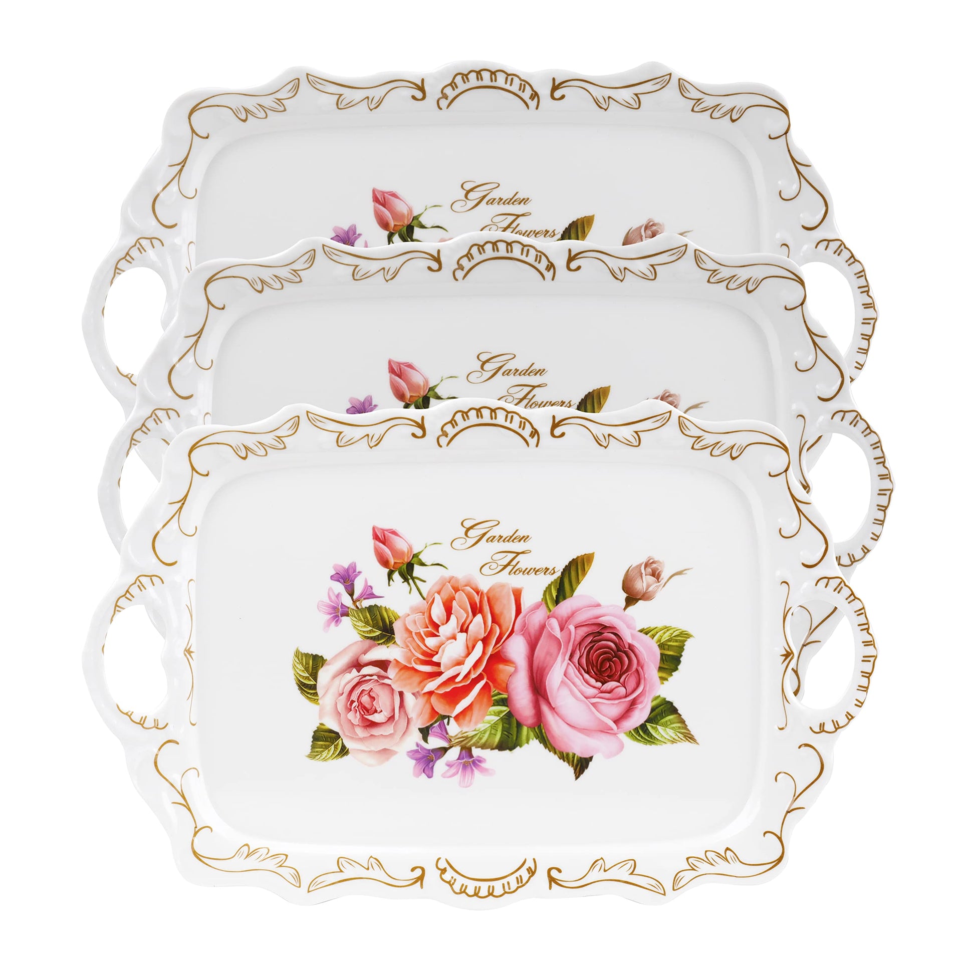Nicunom 3 Pack Serving Trays with Handles, 16" L x 11" W Rectangular Trays for Eating, Melamine Serving Platters for Party, Floral Tray for Serving Food, Cookies, Desserts, Great Gift