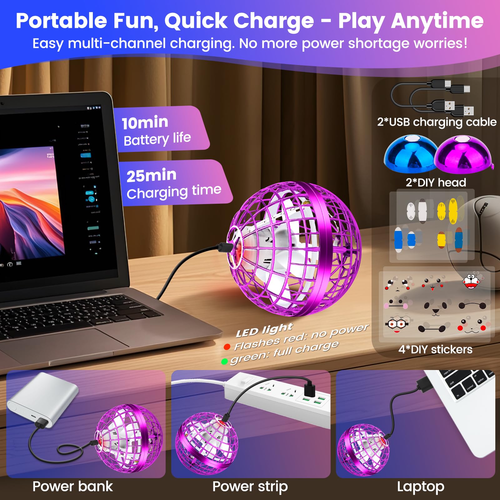 - Portable and Quick to Recharge: Take the fun anywhere with our lightweight, rechargeable flying orb. A quick 30-minute USB charge ensures extended playtime, signaled by a convenient LED indicator. Ideal for gifts, each set includes a flying orb, USB charging cable, user manual, DIY stickers, and a DIY head, providing everything needed for an amazing flying experience. Dear customer, if you have any questions about the flying orb, please feel free to contact us anytime. We're here to help