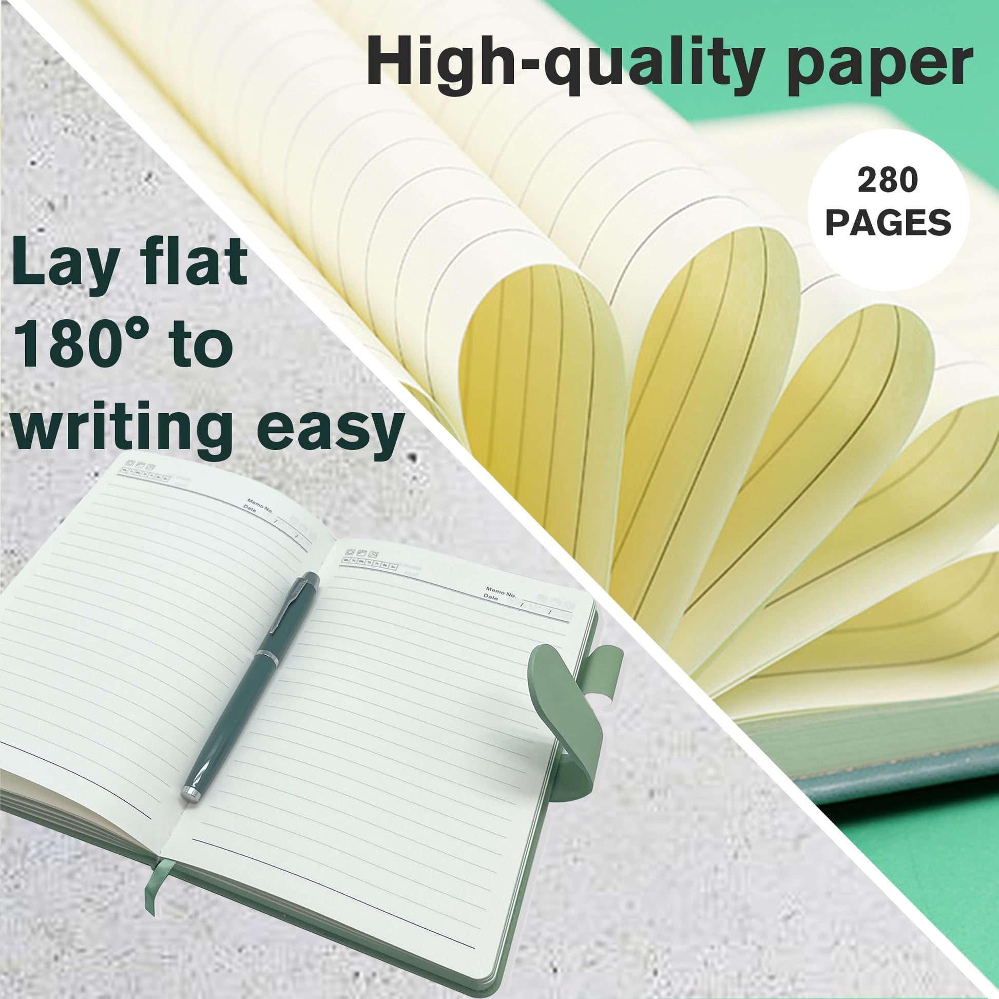 - A5 Size & Generous Capacity - Spacious 8.4' x 5.8' (A5) leather-bound notebook with 140 sheets (280 pages) of thick. Ideal for journaling, sketching, or professional notes. Sleek 5.5' pen fits snugly in the cover loop for portability.