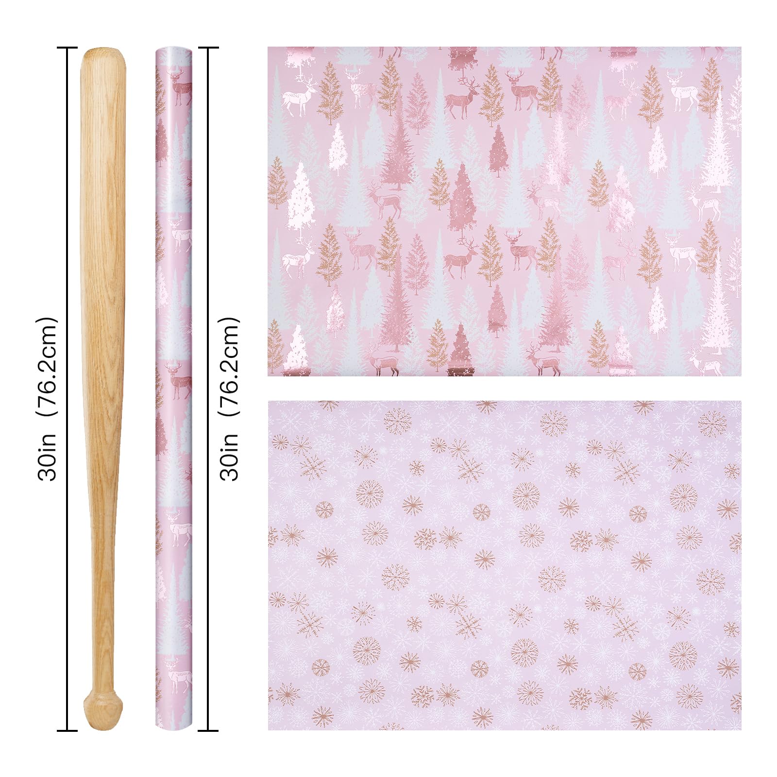 RUSPEPA 30" X 32.8' Reversible Christmas Wrapping Paper Large Paper Roll, Jumbo Roll, Rose Gold Foil Pink Reindeer and Tree Design, Snowflakes Gift Wrap for Girls, Women, Friends, Xmas Holiday Gifts