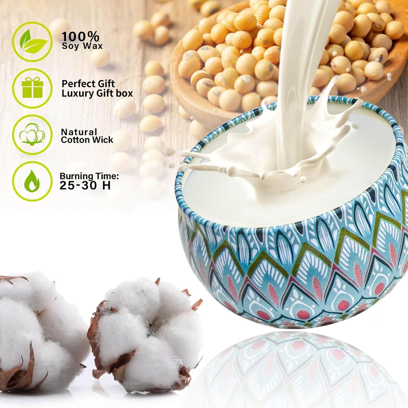 - Long Lasting Candle Set - Each Jar candle contains 2.5 ounces of soy wax and lasts for over 25 hours, you can trim the wick to increase burn time. The complete burning time of 12 scented candles is 300 hours.Candles are packaged in jars printed with beautiful textured patterns, and when burned, the jars can be used to decorate a room or hold small items