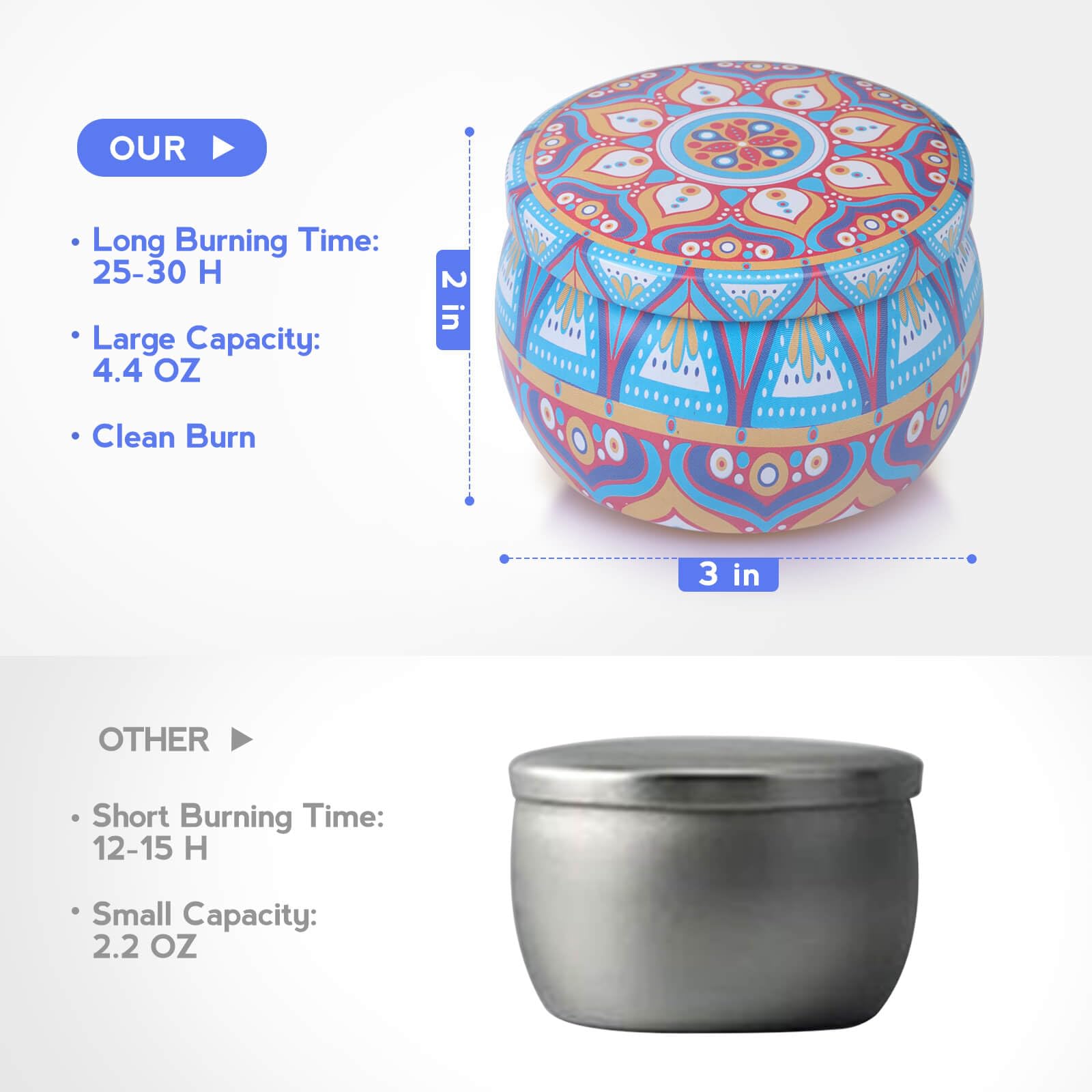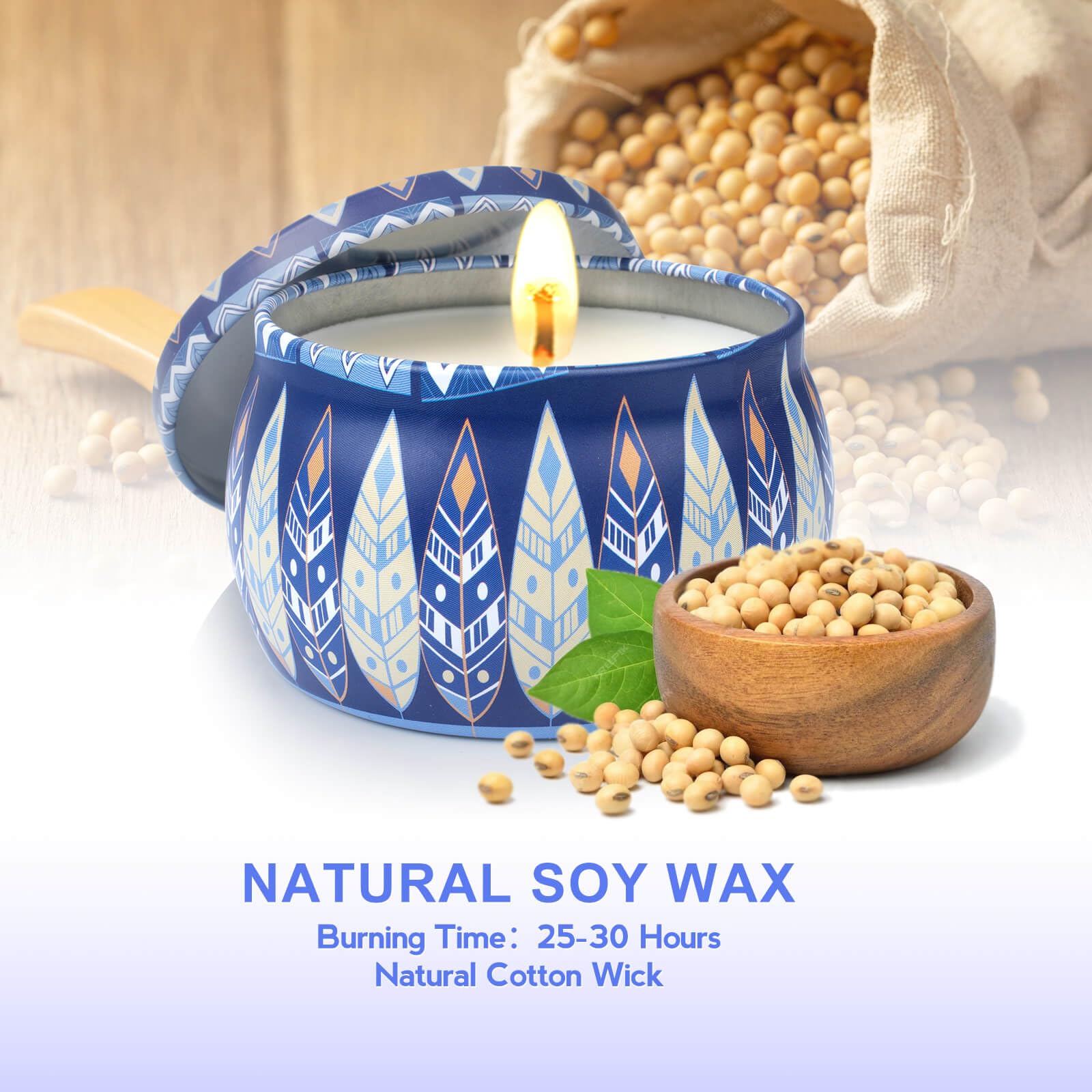 - [Long-Lasting Burn Time – 120 Hours Total] Each 4.4 oz candle burns for 25-30 hours, providing up to 120 hours of total fragrance. The compact 2.95' x 2.95' (round canister) x 2.08' (height) size makes them perfect for bedrooms, bathrooms, offices, or gifting.