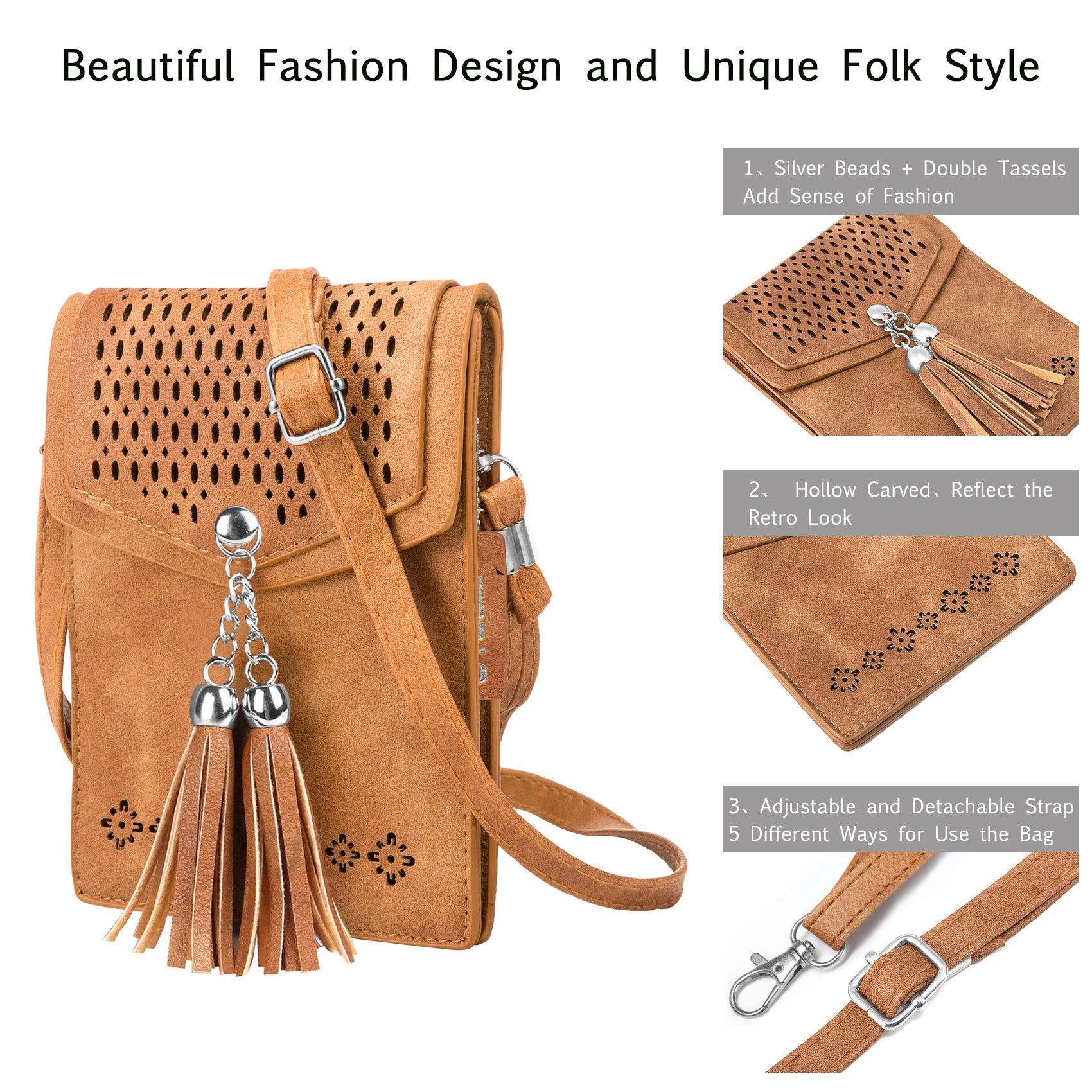 - 【Phone purse for women】IPhone purse case with shoulder strap design with soft PU leather ,Hollow carved and popular elements tassel. which is durable and nice for the small purse crossbody. Ladies can use it as a purse cosmetic bag/lipstick bag for purse, maintain a refined and elegant look.