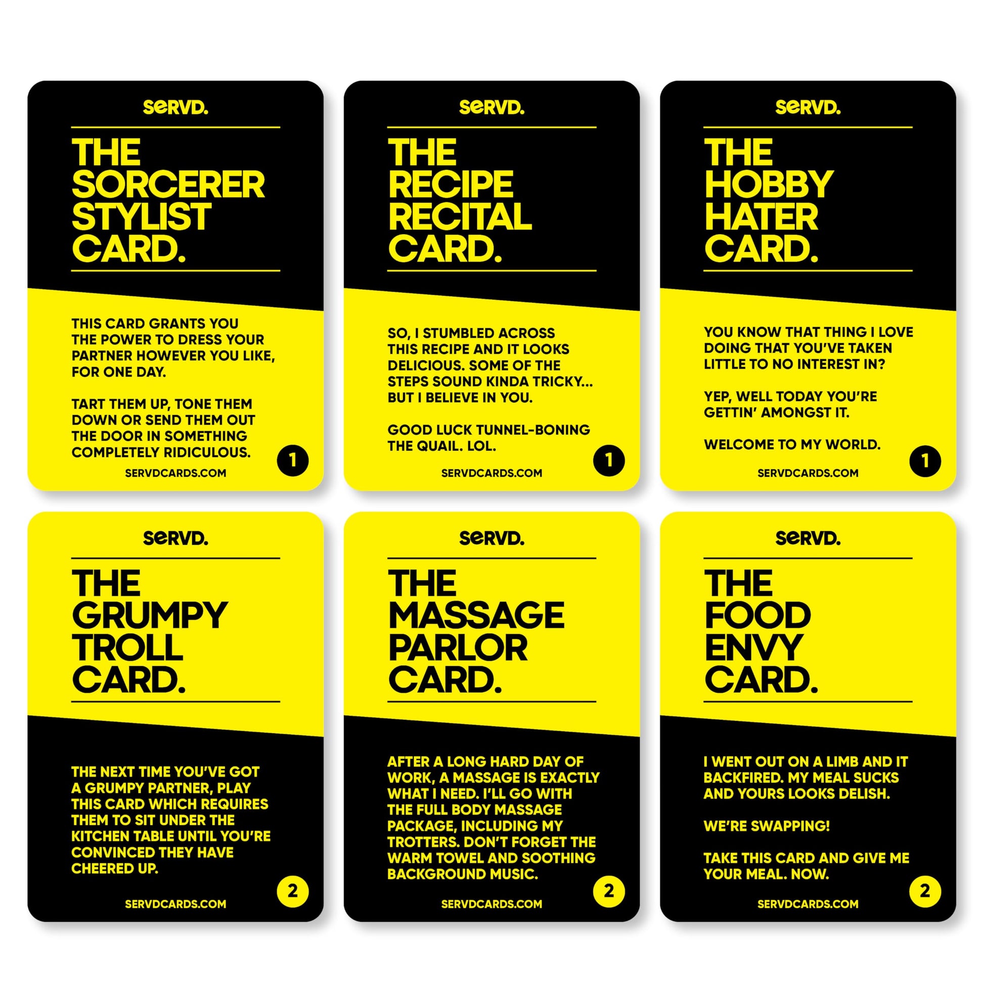 - THE RULES: ONE: Agree to a timeframe (E.g. a week, a month, 6 months). TWO: Split the cards up with each player having their own set of unique cards. THREE: Start dishing out cards whenever and wherever you need. NOTE: Cards can be counteracted, played on top of each other and shut down, making SERVD a game of strategy and careful planning. 2 players only.