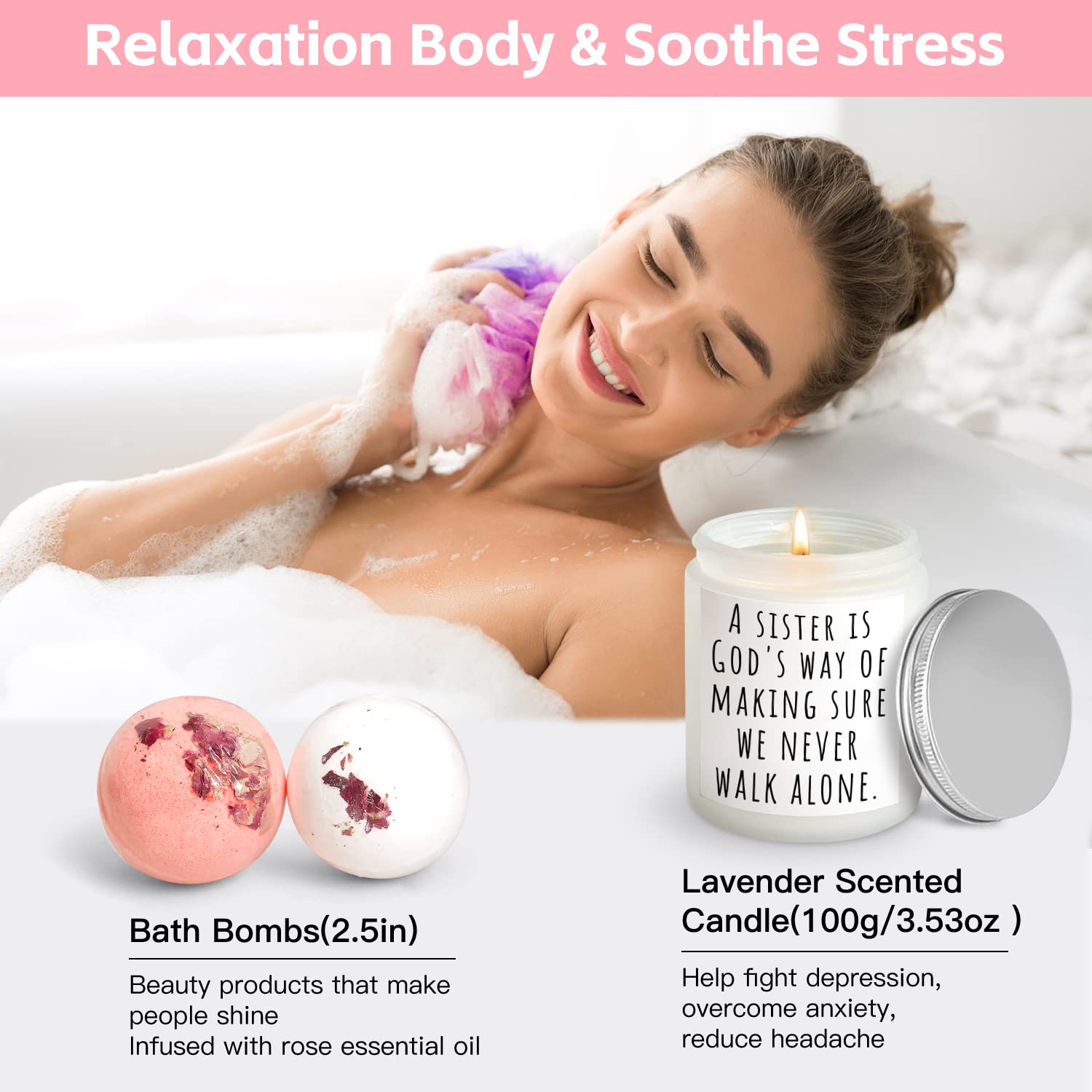 - Unique Gifts for Sister: This sister birthday gifts box contains 9pcs beautifully gifts, a 12oz white Insulated Tumbler with straw & cleaning brush, 14oz Candle that says 'A sister is God's way of making sure we never walk alone', to my sister Poster, Sister Cosmetic Bag, Pink Fizzy Socks that says 'BEST Sister EVER', 2pcs Bath Bomb, Cosmetic Mirror that says ' Not a day over fabulous', Jewelry Dish that says 'Always my sisters, forever my friend',Gift Card