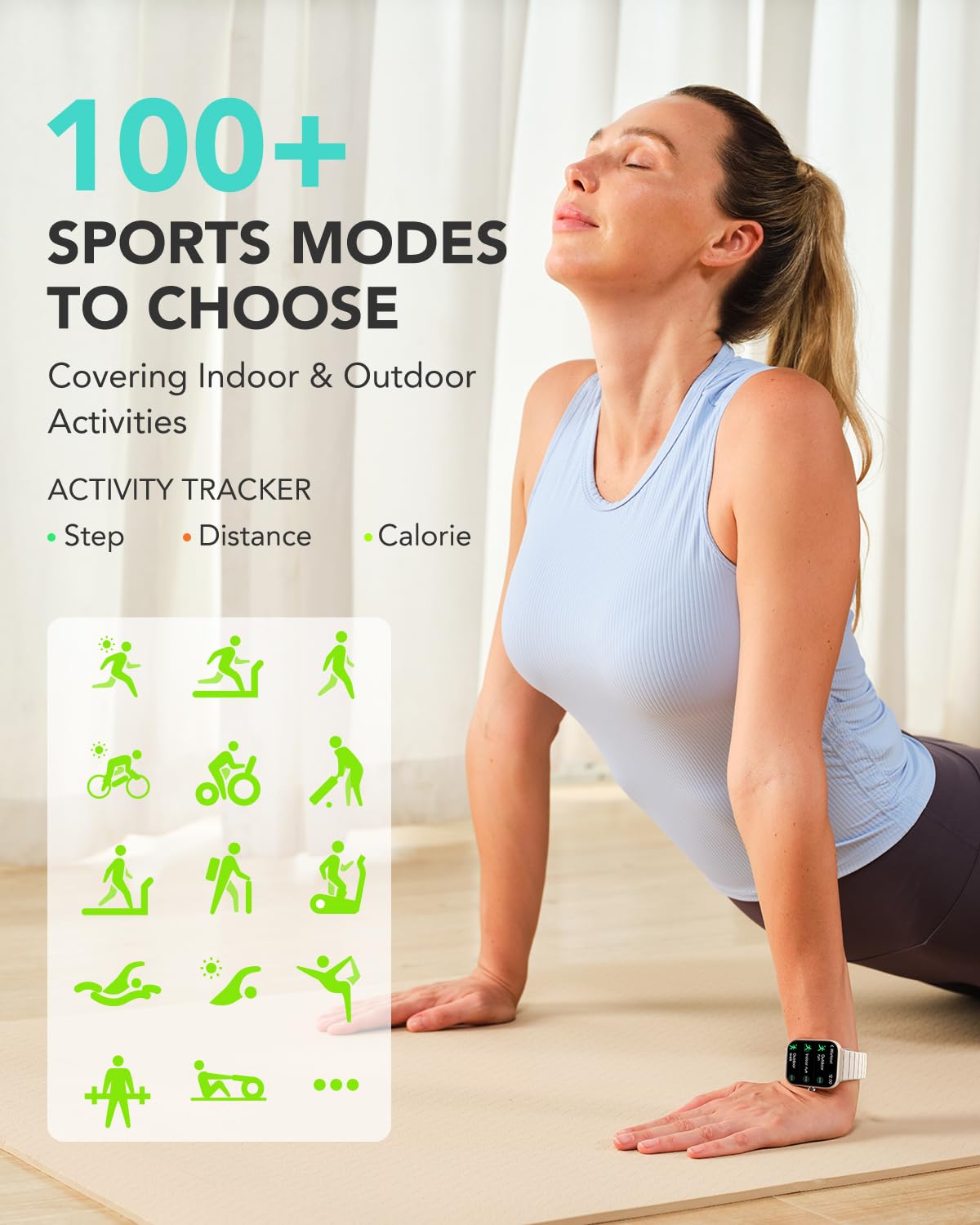 - 100+ SPORTS MODES FITNESS TRACKER: The smart tracker watch for men women supports more than 100+ sports modes, such as walking, running, climbing, hiking, and so on, choose your favorite sports on the watch or inside Veryfit app, set the training goal and achieve, the watch willl monitor the steps, distance, calories during exercise, the periodic data presentation can effectively help you perceive changes and help track the effects of movement.