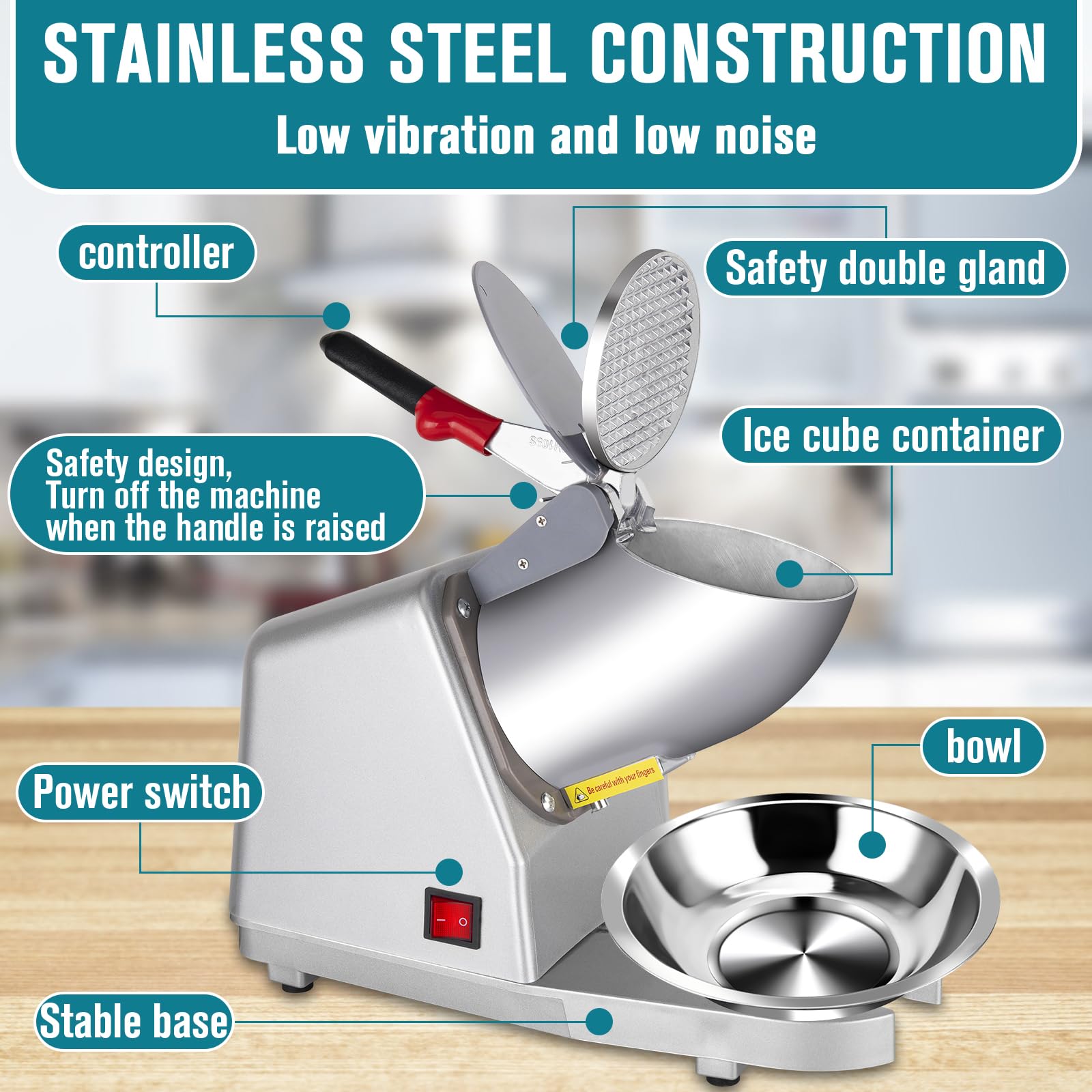 - Easy to operate: The Ice Crusher Ice Shaver features a waterproof on/off switch for easy control, and automatically cuts off the power when the hopper handle is lifted, providing additional safety. Electric Ice Crushers are effortless to operate - just plug in, add ice cubes, and press the non-slip handle to start shaving ice. Snow Cone Maker Machine includes a food grade stainless steel bowl for added convenience