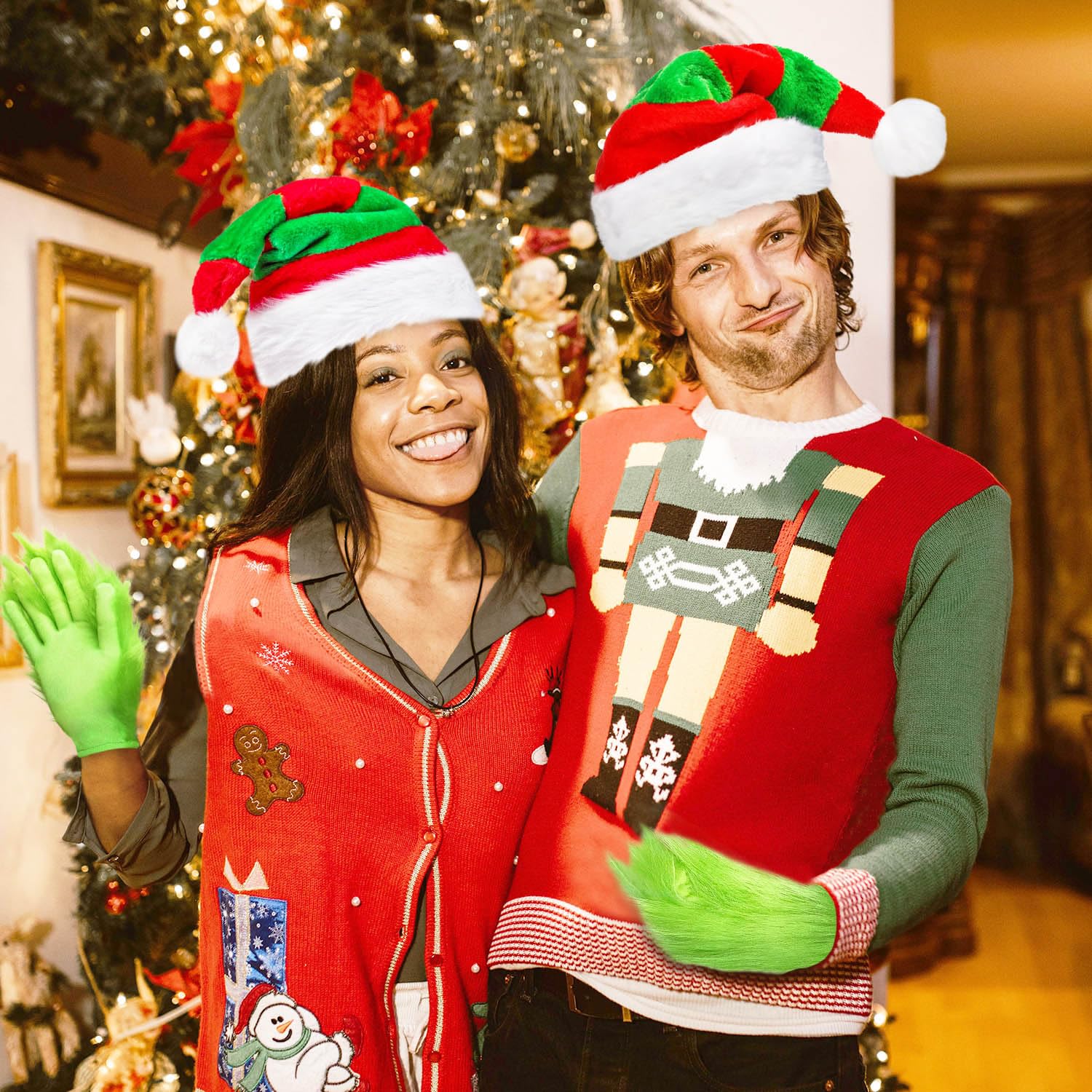 - [The Furry Christmas Costume Accessories Set Include] 1pcs Santa hat, and 1 pair of green furry gloves. Quick and value set for Christmas costume.