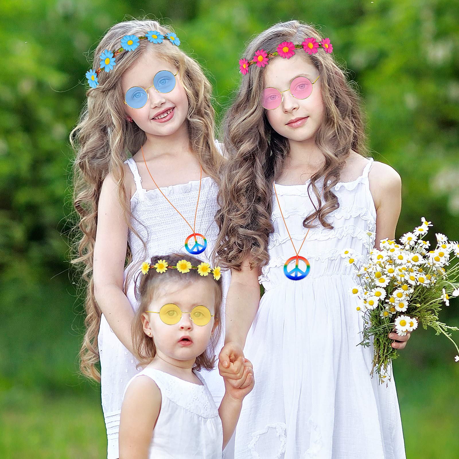 - Packed:10 pieces daisy flower hair headbands, 10 pieces rainbow peace sign necklaces and 10 pairs round hippie sunglasses