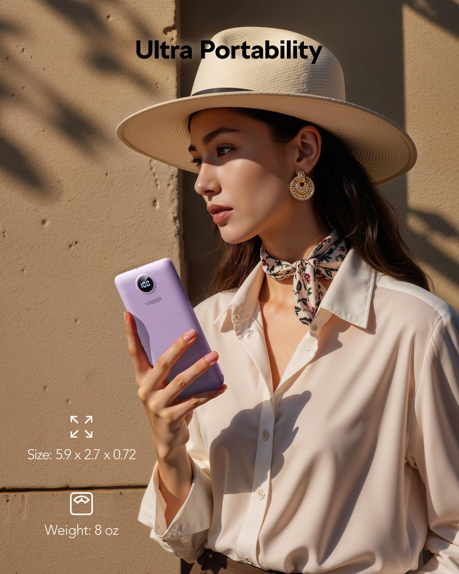 - Slim Body but Powerful 10,000mAh Capacity: With a slim size of 5.9 x 2.7 x 0.72 inches and a light weight of 8oz, this charger packs a powerful 10,000mAh capacity! It provides 1.8 charges for an iPhone 16, 1.6 charges for a Samsung S25, 1 full charge for an iPad Mini 7, or 40 charges for AirPods Pro 2. Perfect for all-day use on trips, commutes, or daily needs.