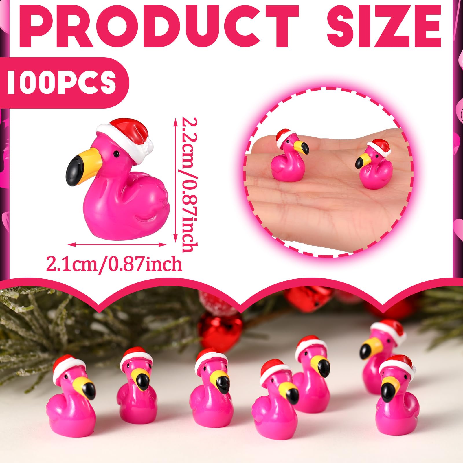 - Cute Size: each christmas flamingo figurine about 0.87 x 0.83 inch/ 2.2 x 2.1 cm, these flamingo tiny ducks are the ideal size for imaginative decoration; Whether creating a whimsical garden scene or a festive indoor display, their compact size makes them fit for hiding in unexpected places, sparking delight