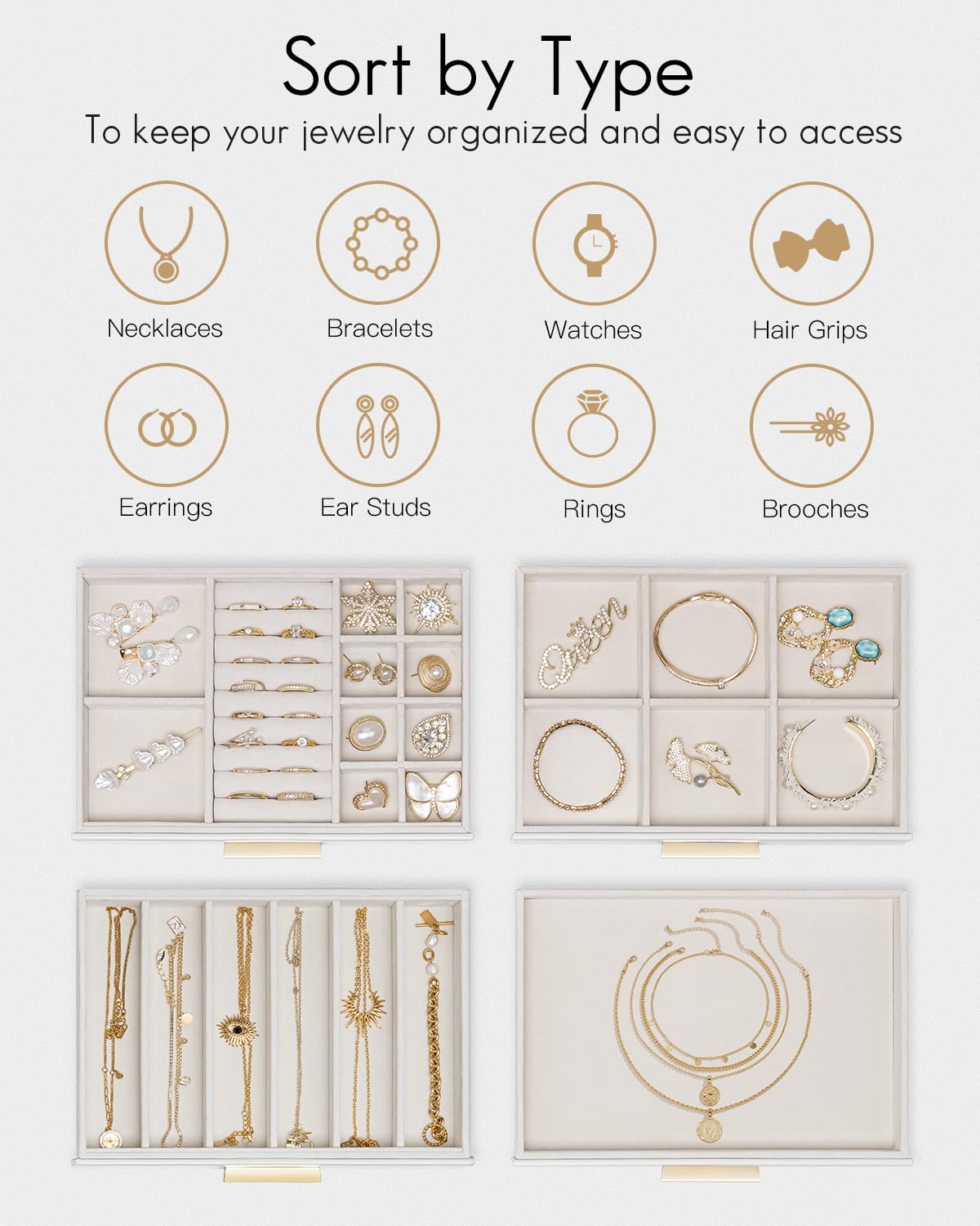 - Simple Layout But Holds A Lot - Rings go in slots, earrings in small cubes, necklaces in the narrow ones, what else? With various layouts and compartments, this jewelry organizer will bring all your treasures under control, from bracelets to studs