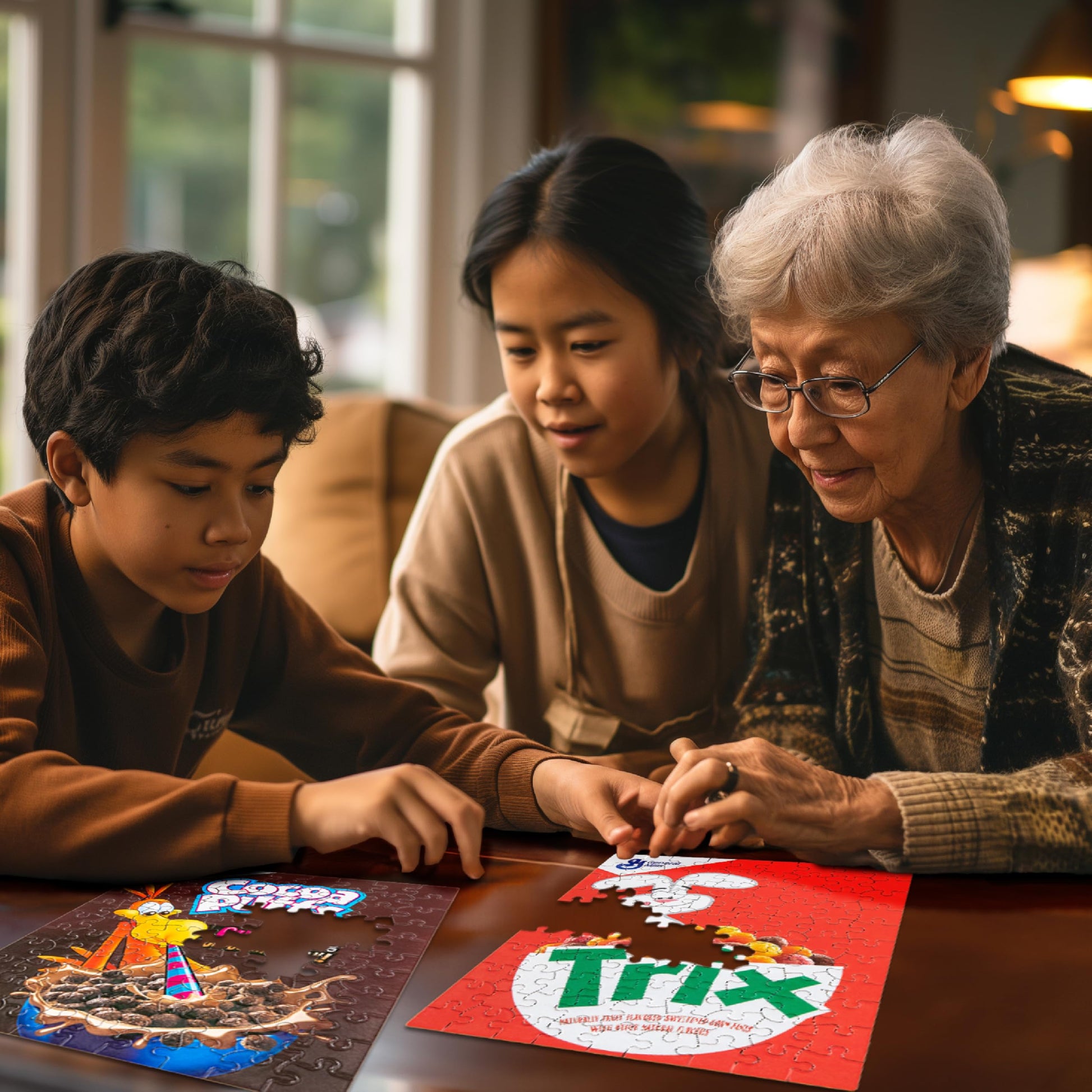 - Six individual puzzles: all your childhood name brands are here in six individual cereal puzzles, each with 100 puzzle pieces. There's Lucky Charms, Cheerios, Honey Nut Cheerios, Cinnamon Toast Crunch, Cocoa Puffs and Trix