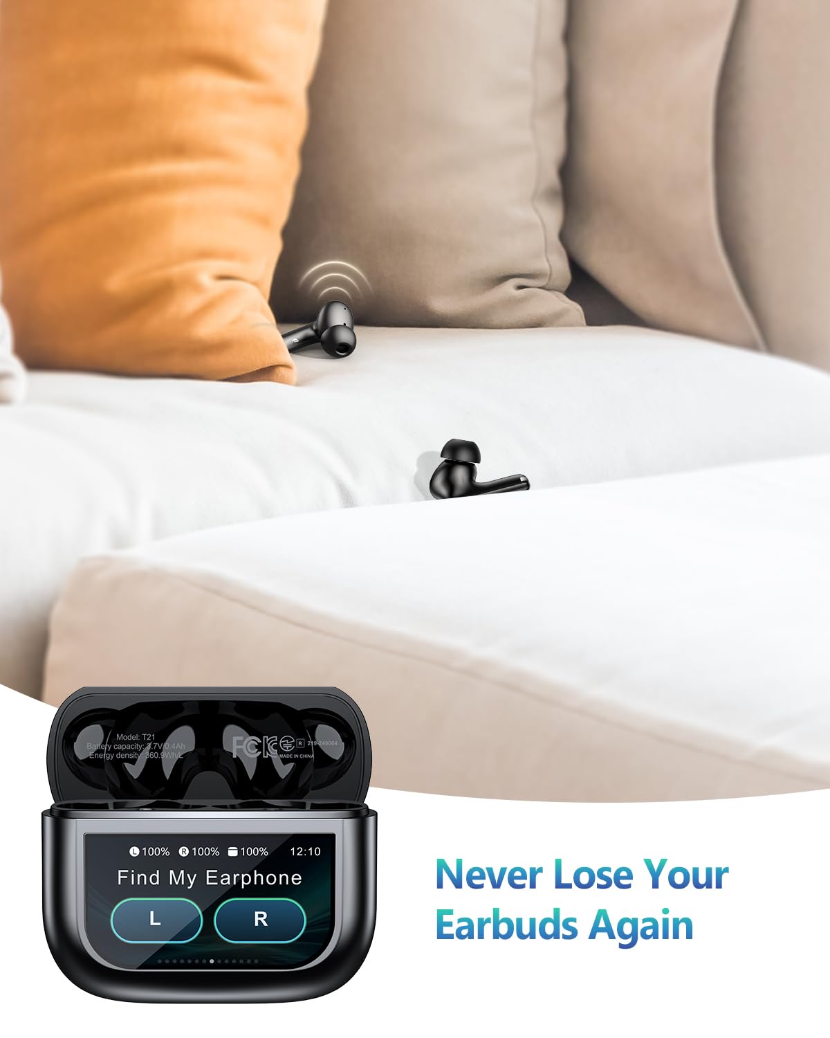 - 【Revolutionary Touchscreen Earbuds】With T21 wireless headphones, you can skip the phone—control music, calls, and AI assistant directly on your Bluetooth earbuds! The first touchscreen earphones lets you swipe to adjust volume, tap to switch ANC modes, and customize EQ presets (Jazz/Rock/Pop/Classic) instantly. T21 ear buds uses the latest Bluetooth 5.3 for easy pairing, automatically connecting with the last paired device when taking the earbuds from the case.