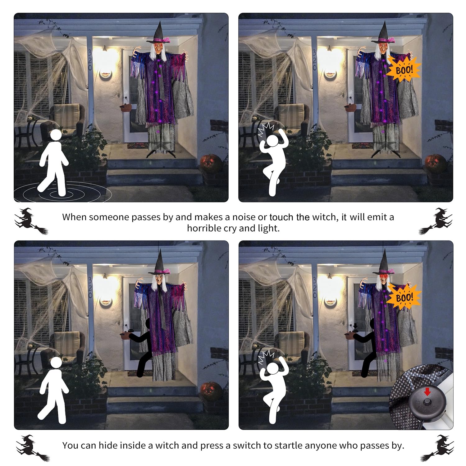 - LIGHTWEIGHT & EASY TO SET: This hanging witches is made of cloth and plastic, the comfortable, light and breathable, delicate cloth cover on the body to achieve a realistic effect. What you need to do is install the base, assemble and insert the pole, then insert the batteries. It also has a hanging lanyard so you can hang the witch without base and pole